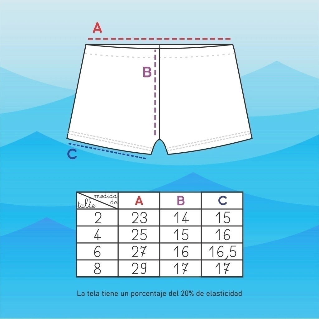 MallaShort confeccionada en Lycra con filtro UV+50, con tiritas para ajustar en cintura.