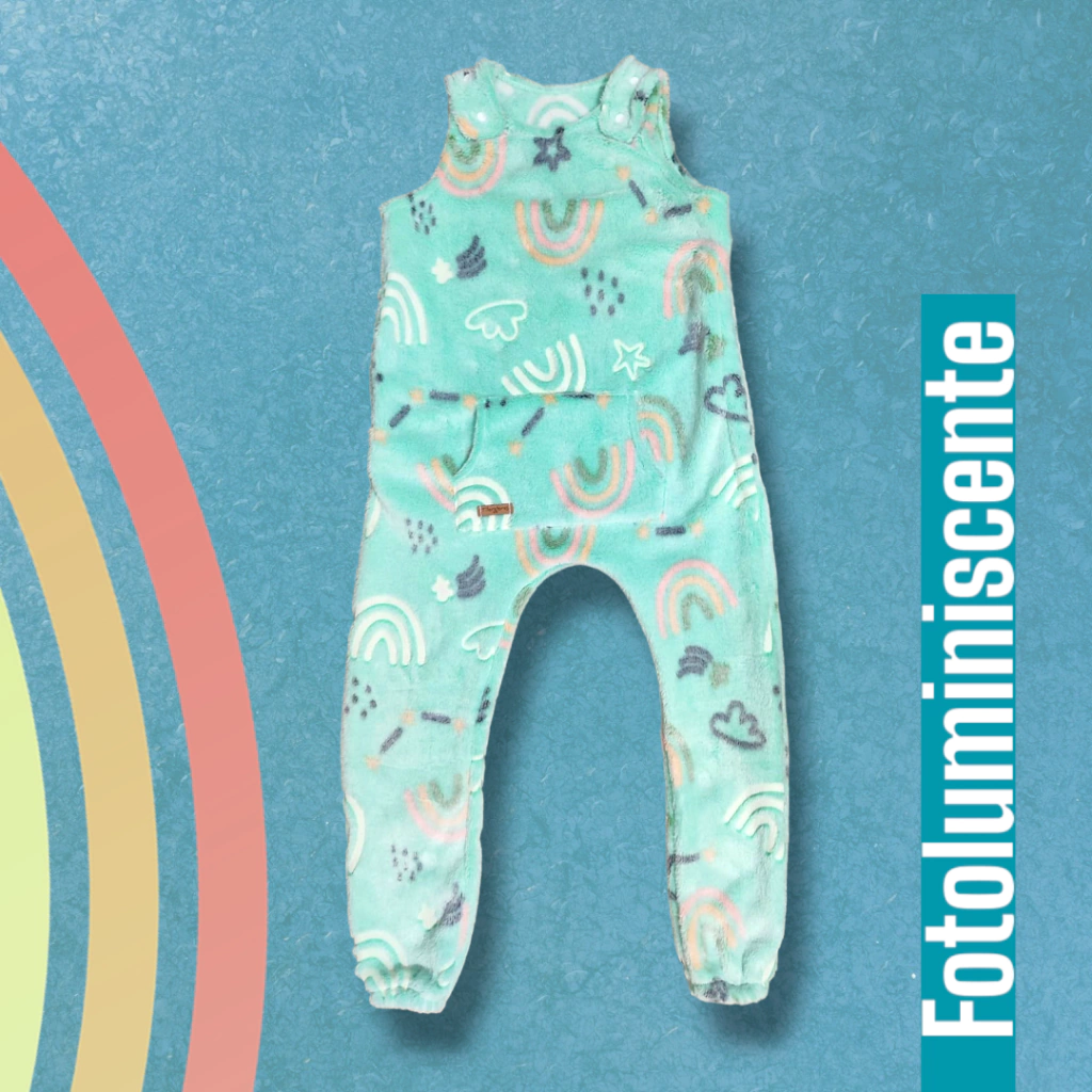 Pijama Evolutivo confeccionado en polar piel, super suave y calentito! Se carga con cualquier fuente lumínica y al apagar la luz los arcoiris blancos brillan.