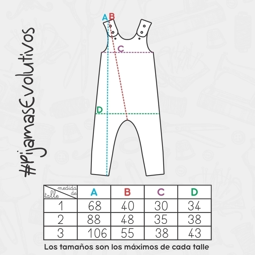 Posee 2 broches a presión (de primera calidad) en hombros, lo que dan 3 posiciones. Ajuste interno para acortar el tiro. Y elástico en tobillo, para mayor comodidad al dormir y al despertarse!